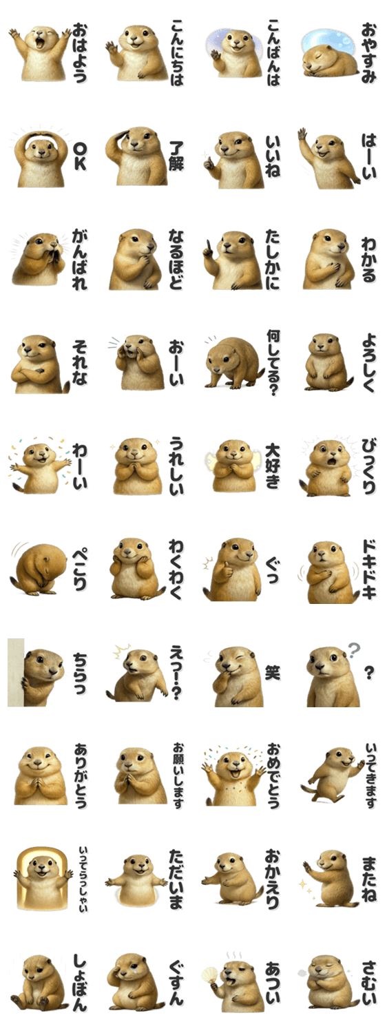 シンプルでかわいいプレーリードッグのスタンプです。/ゆるかわ/使いやすい/毎日使える/動物/アニマル/もふもふ/ほんわか/表情/日常/笑顔/優しい