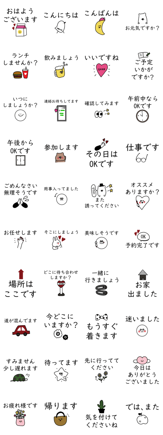 | スタンプ説明 | 予定立てたりするときに便利なスタンプです。敬語入り。約束。友達。ママ友。職場。家族。カップル。恋人。 |