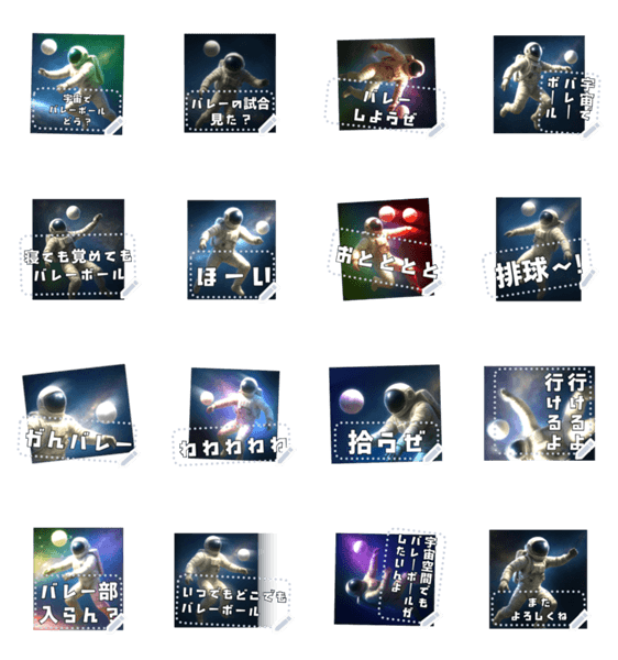 空欄に文を書き込める!宇宙空間でもバレーボールをやめないバレー大好き宇宙飛行士の面白ネタ系スポーツのメッセージスタンプ版★レッツバリボー! 現在この商品は一部のスマートフォン版LINE 10.3.0以上のトークルームでのみ使用できます。動作環境の最新情報はヘルプをご確認ください。