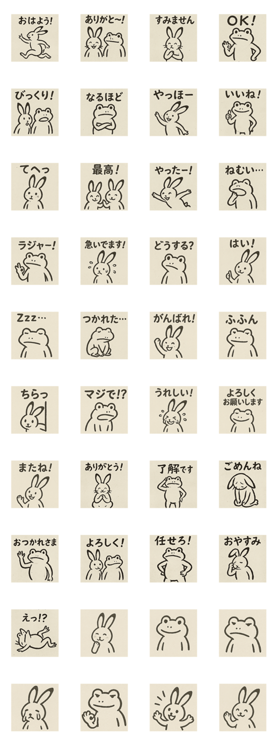 | スタンプ説明 | 墨絵タッチでユーモラスな表情のうさぎとカエル。毎日のやりとりを楽しくします。 |