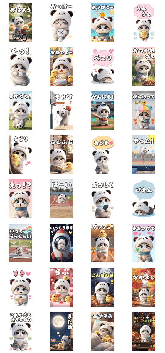 パンダ帽がキュートなネコたちの、可愛く使えるBIGスタンプ です。 ちょっと秋を感じるシチュエーションもあります。 (挨拶、思いや り、気遣い、陸上、秋、子猫) ※このスタンプはトークルームで大きく表示されるBIGスタンプです。