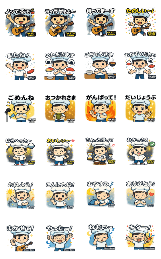 | スタンプ説明 | 「おかずバンド」のシェフが登場!元気いっぱいでかわいいアコースティックギター担当キャラの日常会話スタンプです。 |