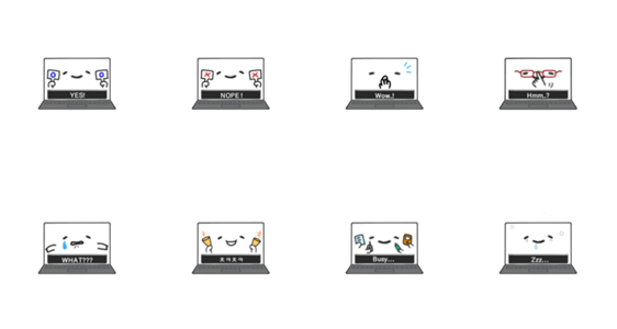 | スタンプ説明 | A cute laptop character shows commonly used office expressions. |