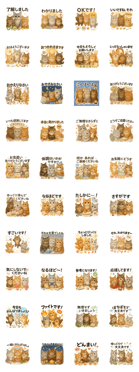 | スタンプ説明 | 手紙のように丁寧な言葉で、かわいいメインクーンたちが、挨拶から応援まで心を込めてお届け。ふわふわメインクーンの感謝・いたわり・お願いも。 |