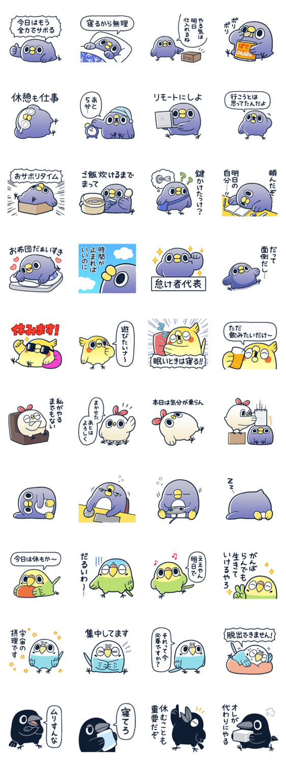 | スタンプ説明 | 面倒だがトリあえず返信のめんトリです。めんとりじゃないです。初心に立ち返ってダラダラする33弾です。 |