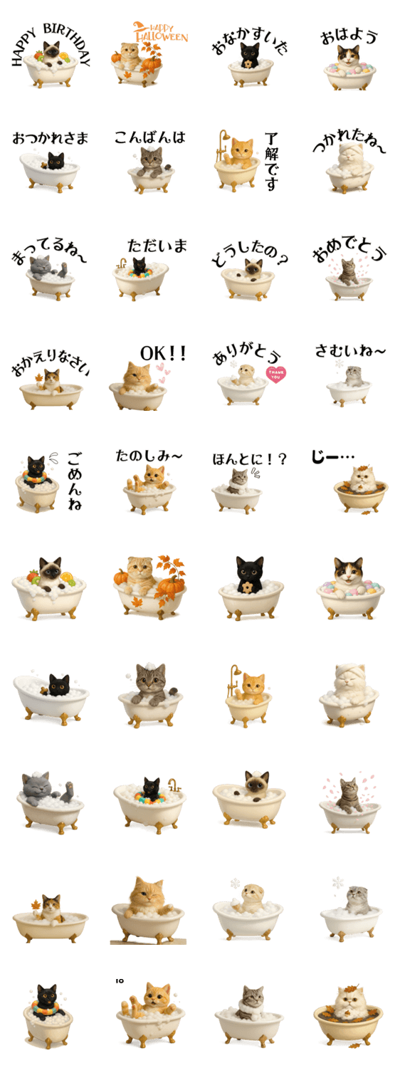 にゃんこ泡風呂パラダイス登場!ヨーロッパ風バスタブ、クラシック泡風呂、スイーツ、季節バスタイムなど可愛い猫(ねこ)スタンプで癒しと笑顔を届けます。
