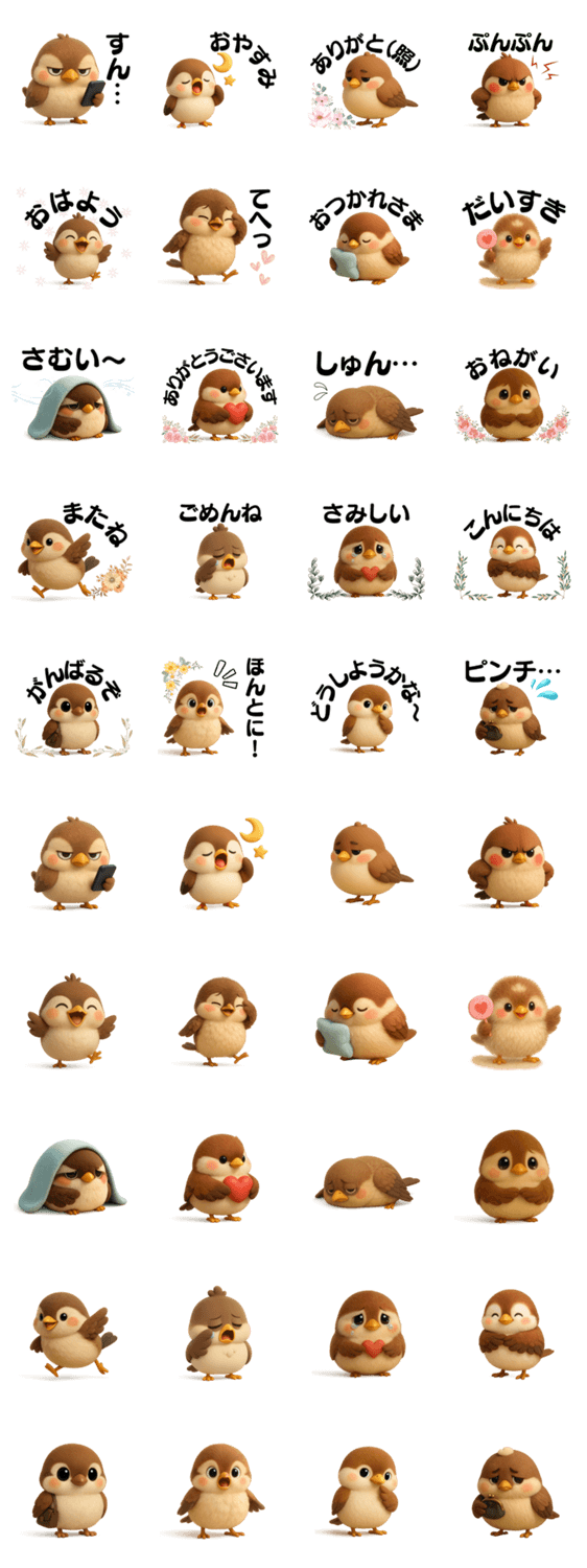 ふっくらかわいい雀の「ちゅんぽや」です。 すずめらしい仕草で、ねむい・おこ・おつかれ・だいすきなど毎日使える表情がいっぱい! 癒し系・ゆるかわ好きにぴったり!