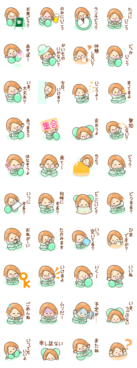 お誘いや返事の場面でつかいやすいスタンプです。 お茶どう?/のみにいこう/ランチどう?/たべにいこう/あそぼー/かいものいかない?/休憩しない?/どっかいこう 等です