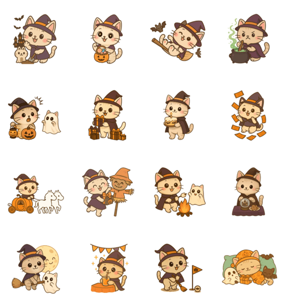 Meowloween! A spooky-cute witch cat with pumpkin rides, broomstick flights, and magic spells to brighten your chats.