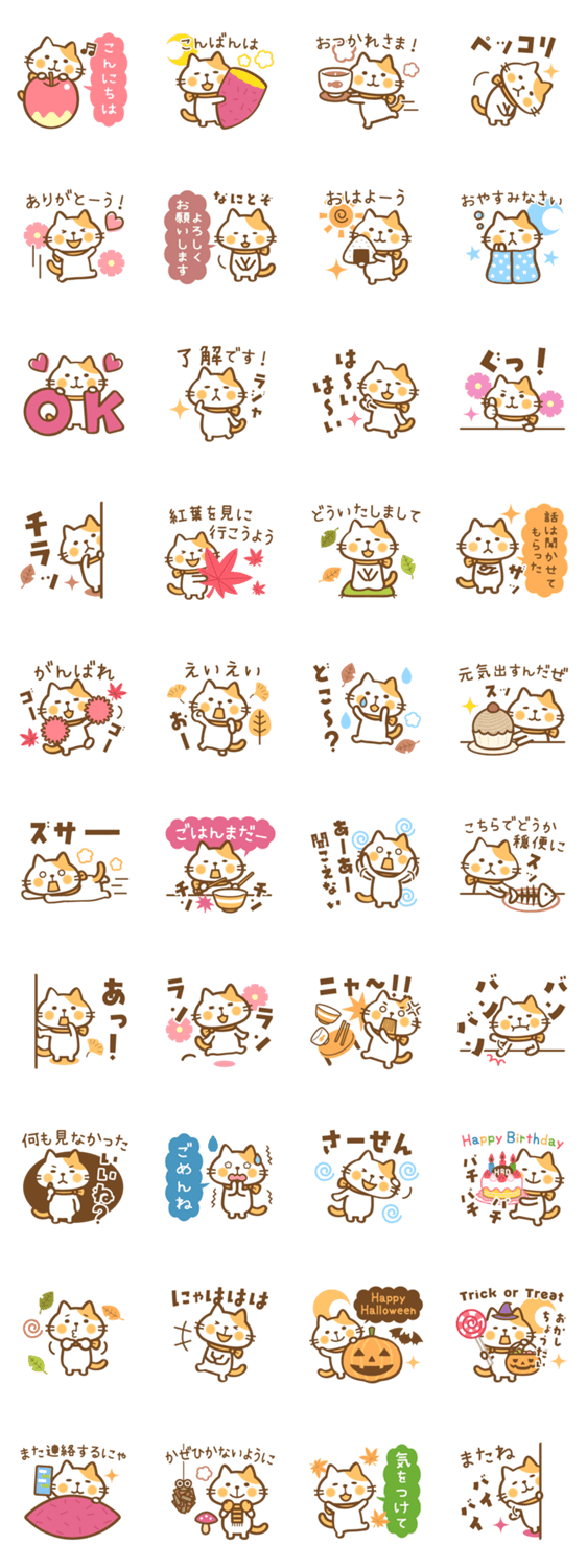 | スタンプ説明 | 毎日使える猫のねこ田さんのシンプルなスタンプが出来ました。 秋に使いやすいスタンプもあります。 ハロウィン・お誕生日のスタンプ付き! |