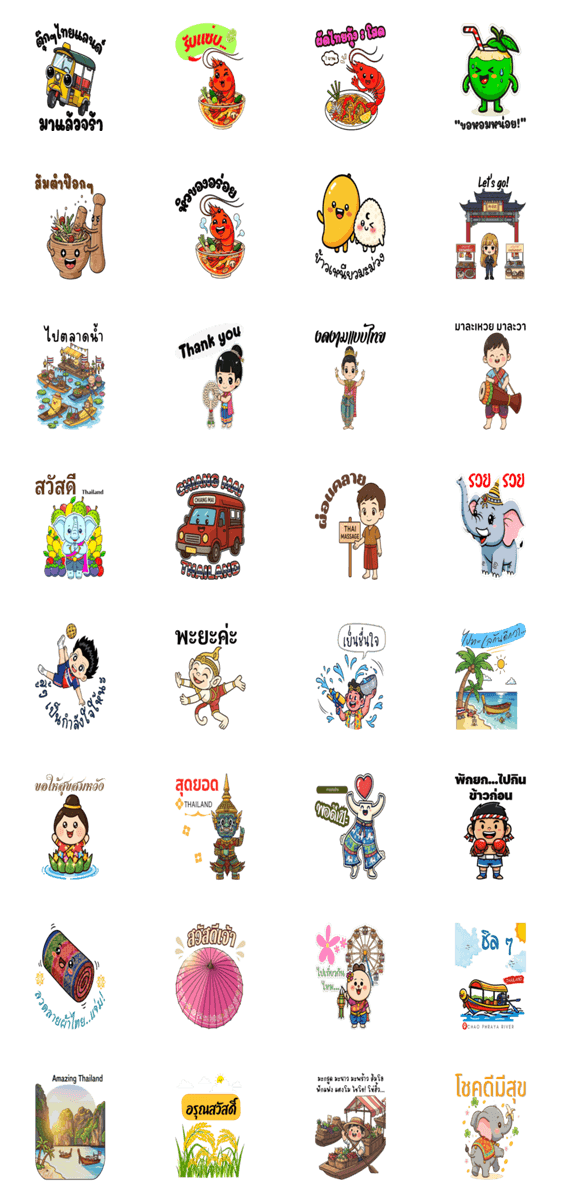 タイ風のかわいいスタンプ。食べ物、文化、観光、笑顔まで、どんなシーンにもぴったり。 ※このスタンプはトークルームで大きく表示されるBIGスタンプです。