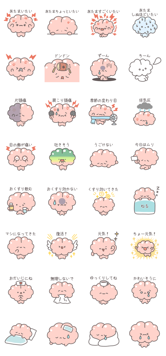 頭痛持ちさんのためのスタンプです。頭痛/片頭痛/偏頭痛/緊張型頭痛/群発頭痛/頭痛もち/薬/体調不良/生理/キャラクター/きもかわ/かわいい/面白い/脳みそ