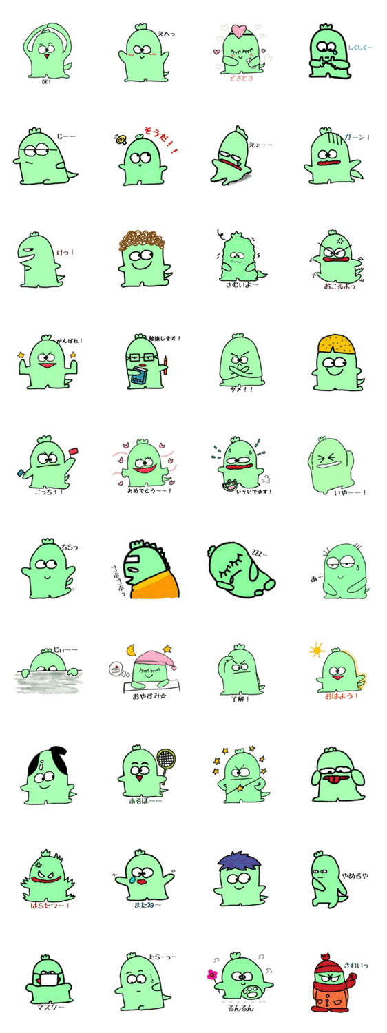 | スタンプ説明 | みどり色のかわいいかいじゅうさんのスタンプ。返事やあいさつのお供に、ぜひこのかいじゅうさんを! |