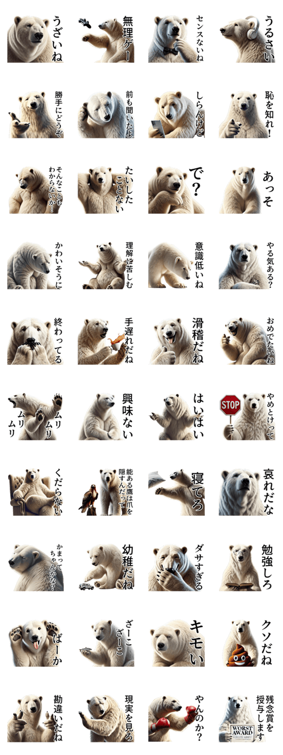 | スタンプ説明 | リアクション/ふざける/ギャグ/毎日使える/よく使う言葉/シンプル/日常/敬語/使いやすい/クマ/くま/白い/友達/家族/恋人/可愛い/面白い/シュール/毒舌/ネガティブ |