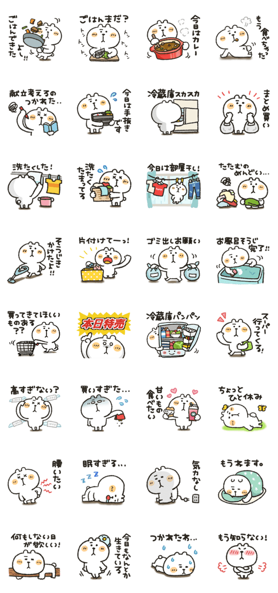 くまぴのスタンプお母さんが使える家事疲れたバージョンです。洗濯干し/献立/買い物/お使い/ごはん/夕飯/冷蔵庫/部屋干し/掃除機/お風呂掃除/ゴミ出し