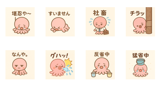 | スタンプ説明 | 脱力系でかわいいタコのスタンプです。 堪忍や~・すいません・グハッ!など、謝罪から日常リアクションまで使えます。 |
