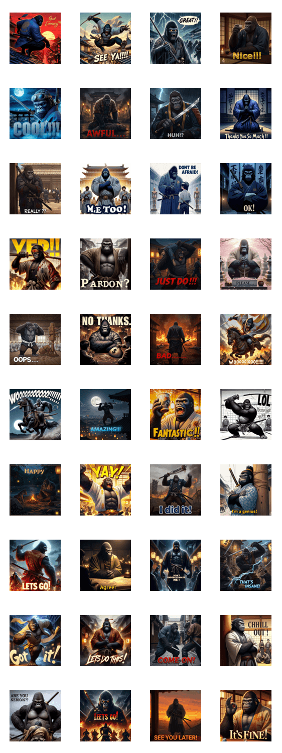 剣を握るゴリラ侍!迫力満点の戦士の姿が、あなたの会話に熱いバトル精神を加えます。戦いの準備は整った!