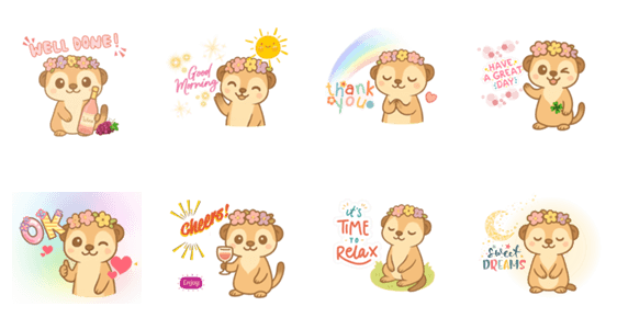 花冠をつけた愛らしいミーアキャットが、あなたの日常会話を華やかに彩ります。挨拶や大切な気持ちを陽気に人懐っこく、ほっっこりと伝えるのにぴったりです。