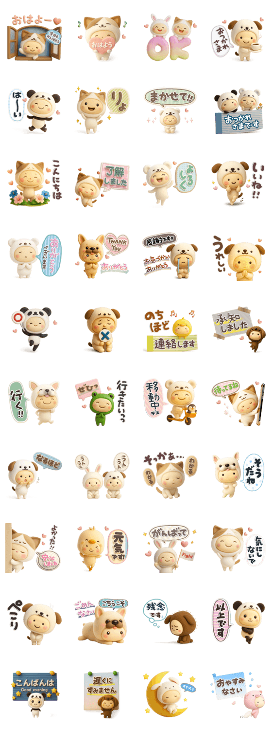 きぐるみ団の挨拶とお返事のふんわり3Dスタンプです。日常よく使う/毎日/一年中/家族/友達/連絡/日常会話/挨拶/リアクション
