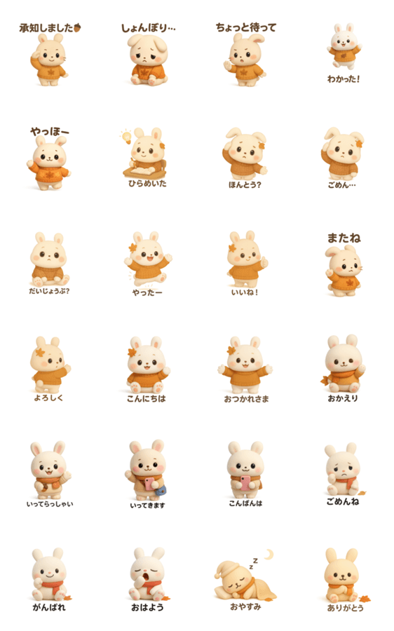 うさっちの秋の装いのスタンプです。承知しました、またね、ありがとうなど、毎日使える挨拶や日常会話が満載。秋の葉っぱと癒し系の表情でトークを和ませます。