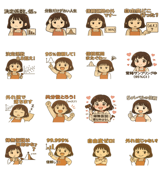 統計好き・数学好きにぴったり!「自由度ゼロ」「外れ値で落ちます」など、研究室や日常会話で使えるシュールなスタンプセット。ユーモアたっぷりに気持ちを伝えよう。