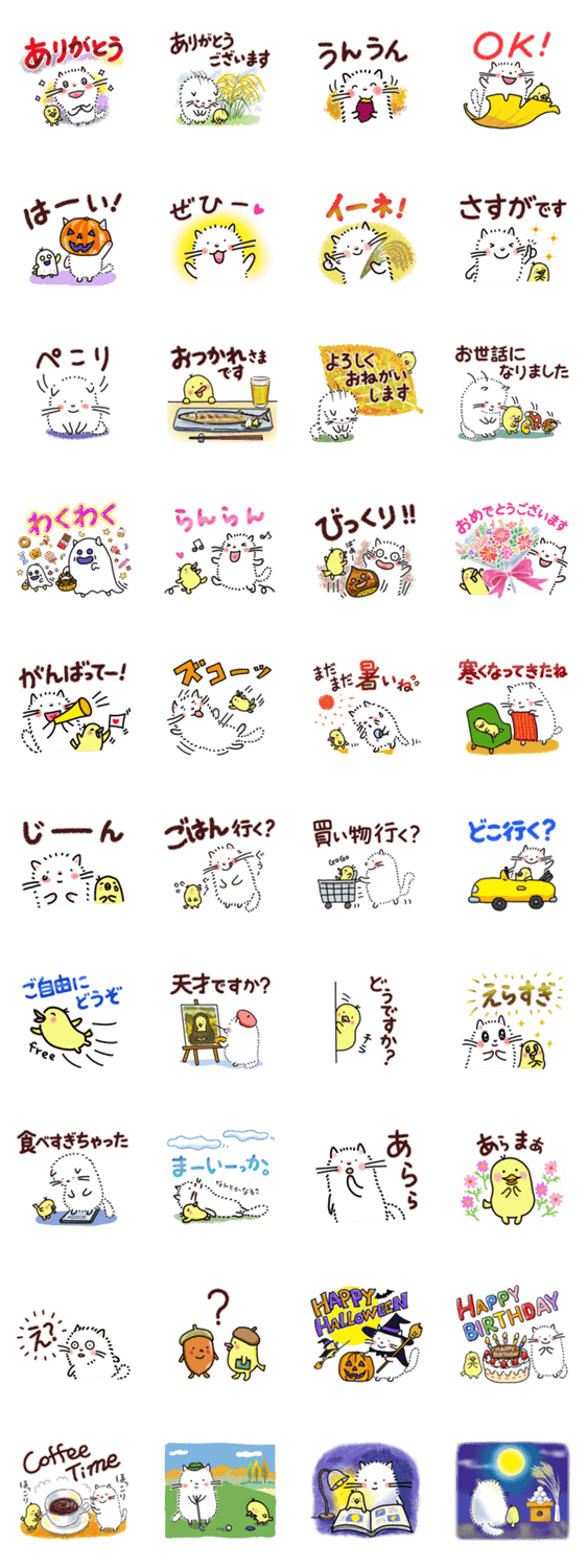 ふわふわねこさんとひよこさんの秋のスタンプです。