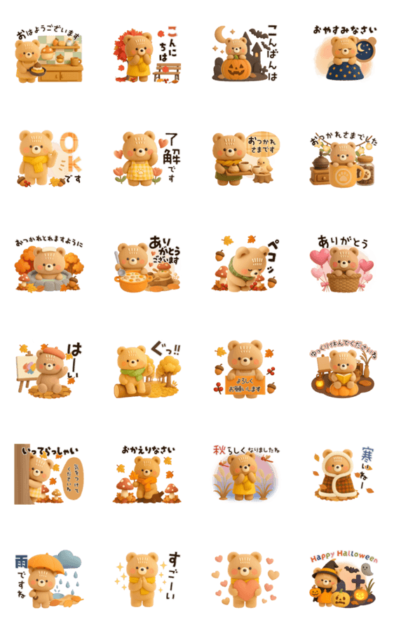 「ありがとう」「おつかれさま」など気持ちを伝えやすい言葉がいっぱい!秋の気配と可愛いくまさんで、毎日トークを彩ります。