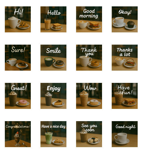 | スタンプ説明 | Cute and fun cafe stickers for daily chats! Easy to use for greetings, thanks, and casual messages. Perfect to express your feelings with coffee time vibes! |