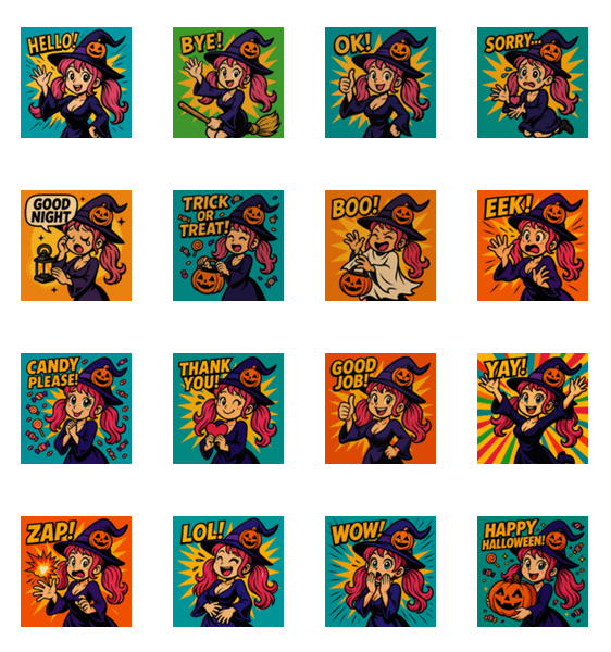 | スタンプ説明 | ドジっ子魔女「Twiny」のポップでかわいいハロウィンスタンプ! 明るく鮮やかなアメコミ風デザインで、日常のトークをもっと楽しく。 |