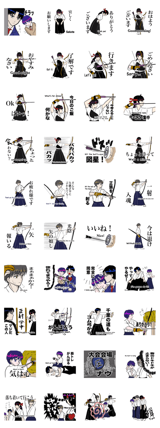 弓道を愛する全ての人に捧げるスタンプ。部活・町の稽古の円滑なコミュニケーションにお役立て下さい。