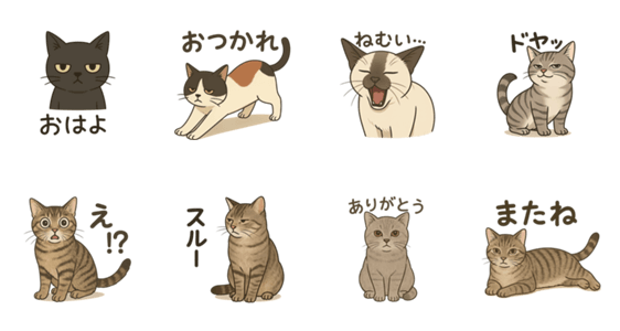 | スタンプ説明 | 真顔ネコやドヤネコ、あくびネコなど、いろんな猫たちが日常フレーズをシュールにお届け。使うたびにクスッと笑える、毎日使いやすいスタンプです。 |