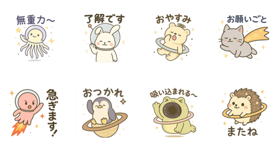 | スタンプ説明 | 宇宙クラゲや火星ウサギ、リングペンギンなど、かわいくてちょっぴりシュールな宇宙の仲間たちが日常会話を彩ります。毎日使える癒し系スタンプ。 |