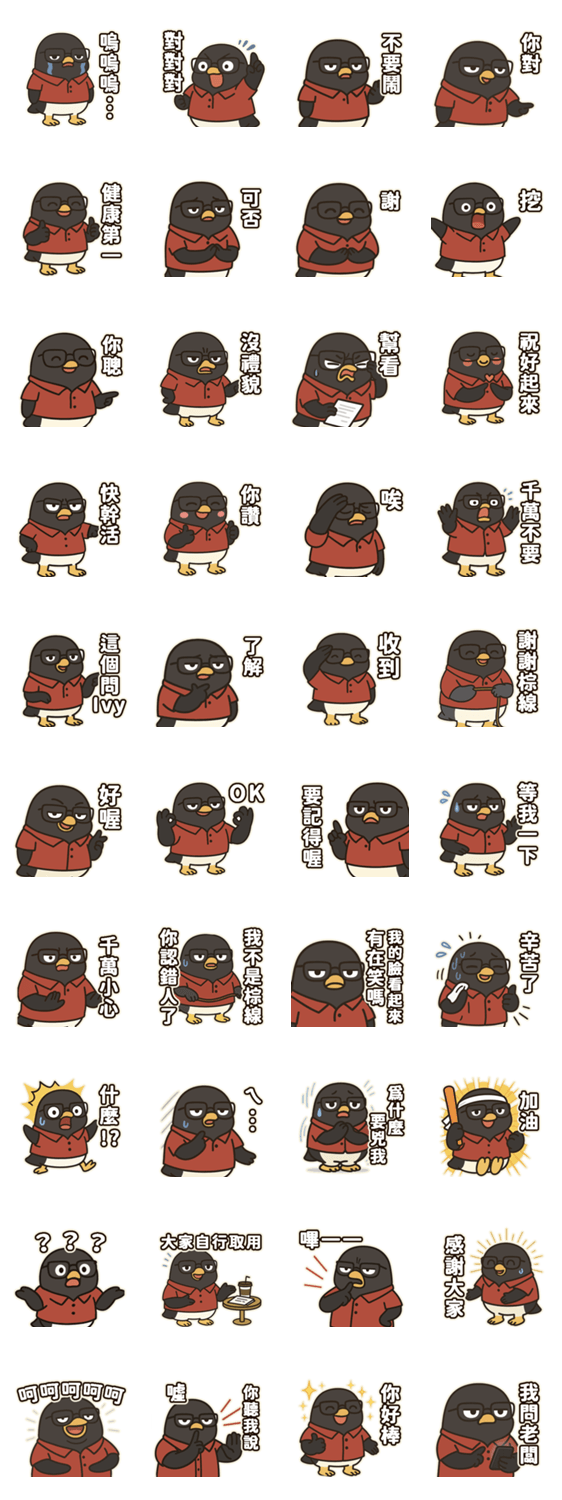 | スタンプ説明 | Born from a real coworker's endless catchphrases and daily office drama. He's skinny in real life, but here he's a round, chubby penguin in a shirt and tie. |