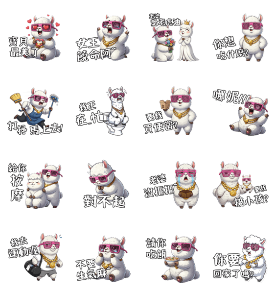 | スタンプ説明 | A white creature resembling a lama. This episode features a collection of stickers for husbands, with sweet and funny words that are meant only for their wife. |