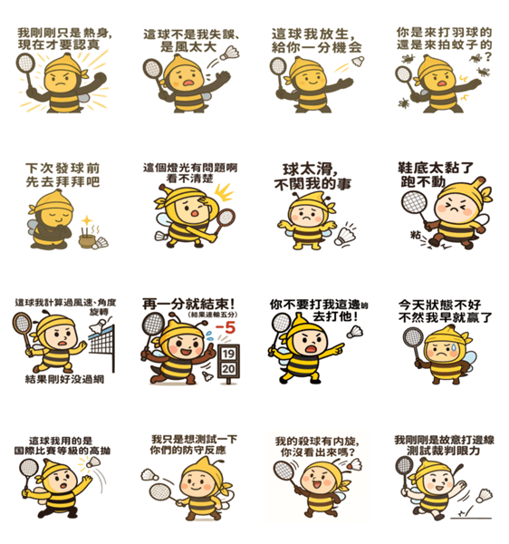 Bee Jiao steps onto the court! This sticker set is made for badminton lovers, packed with classic court-side talk.