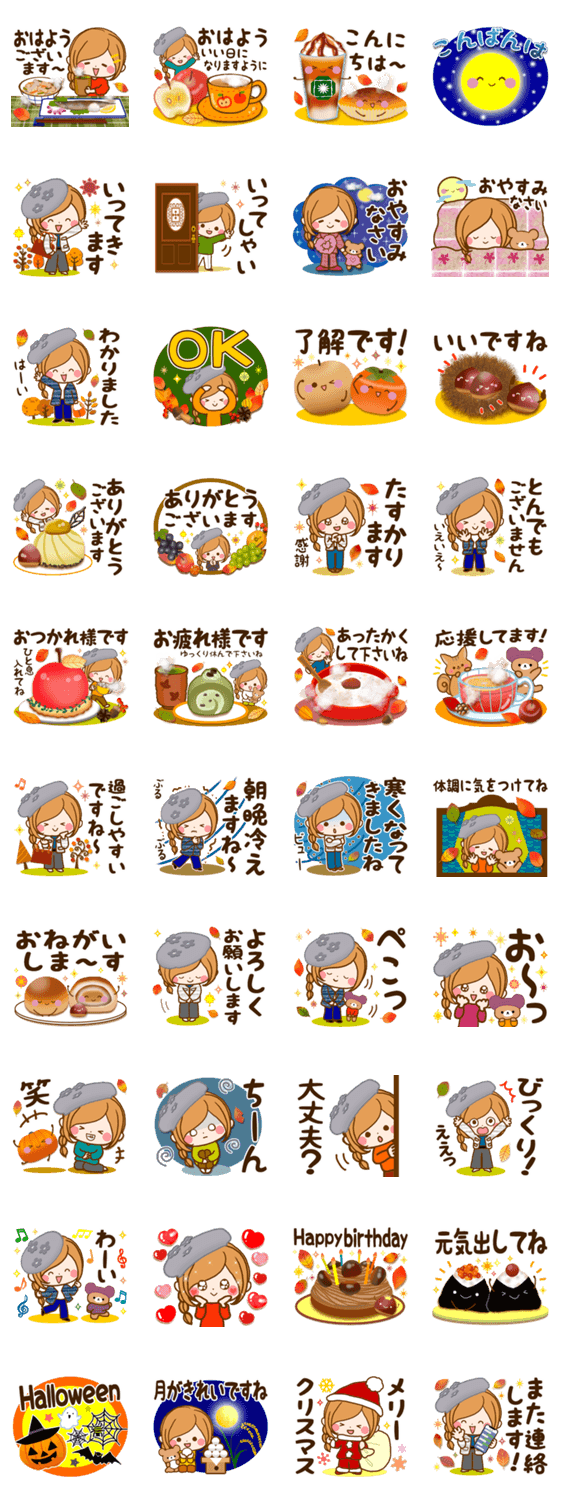 秋冬ず~っと使えるやさしい日常スタンプです♪挨拶、敬語多めで使う相手を選ばず便利♡「ほのぼのカノジョ」シリーズ◆◆/紅葉/リス/十五夜/お月見/ハロウィン/クリスマス