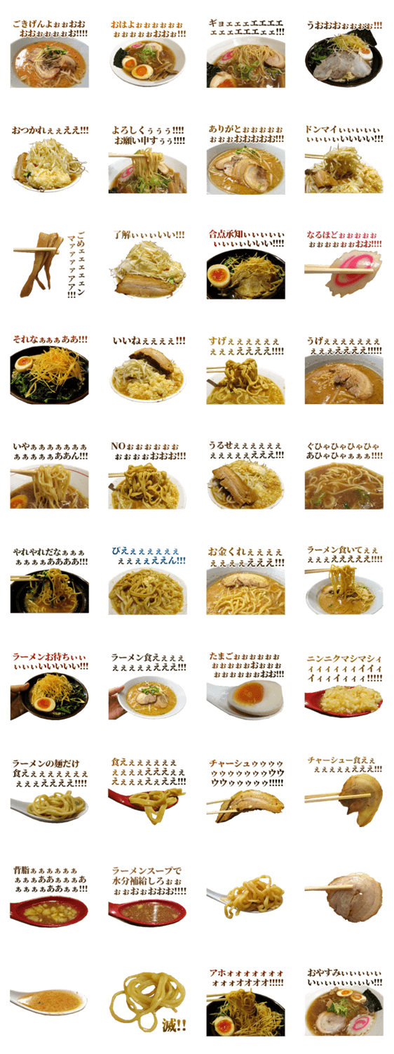 なんかうるさい感じのラーメンのスタンプです。らーめん、Ramen、麺類、飯テロ、チャーシュー、味玉、中華、デカ盛り、メンマ、ナルト、拉麺。実写食べ物スタンプシリーズ