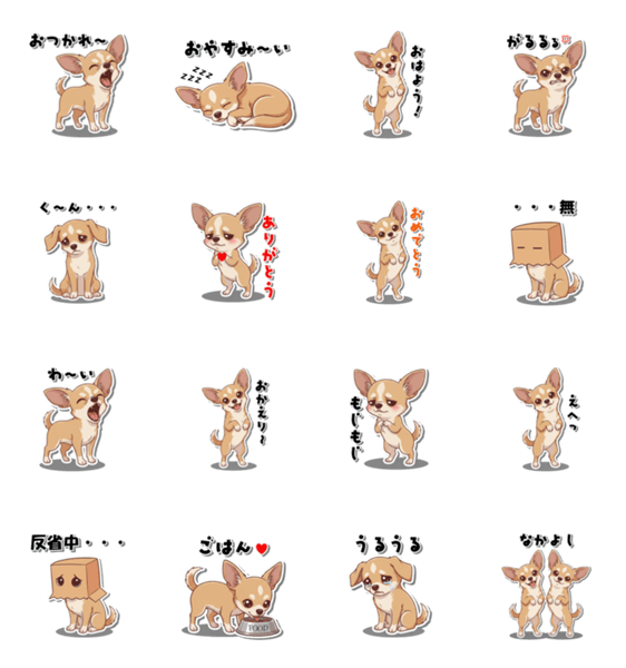 | スタンプ説明 | ちょっと恥ずかしがり屋のキュート可愛いチワワちゃんスタンプ。文字ありバージョン |
