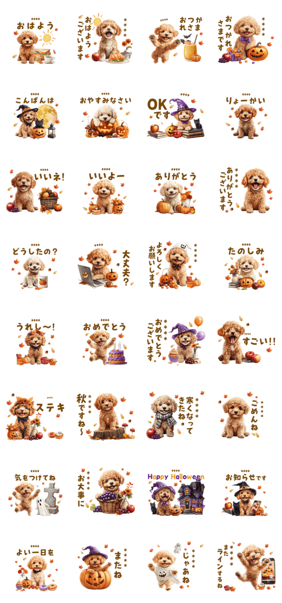 名前を自由に入れて自分だけの特別なスタンプに♪ 秋を感じるトイプードルのスタンプです。日常の会話やあいさつにぴったり!