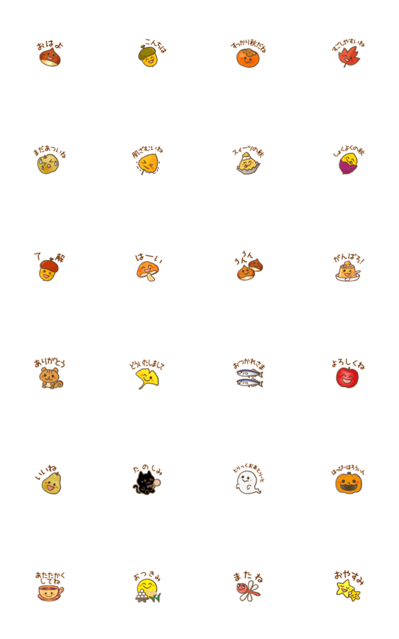 色とりどりの紅葉やどんぐり、秋の味覚、フルーツたちがかわいく飛び出します!ハロウィンモチーフも。ちいさくて可愛くて使いやすい秋の日常に毎日使える便利なスタンプ!