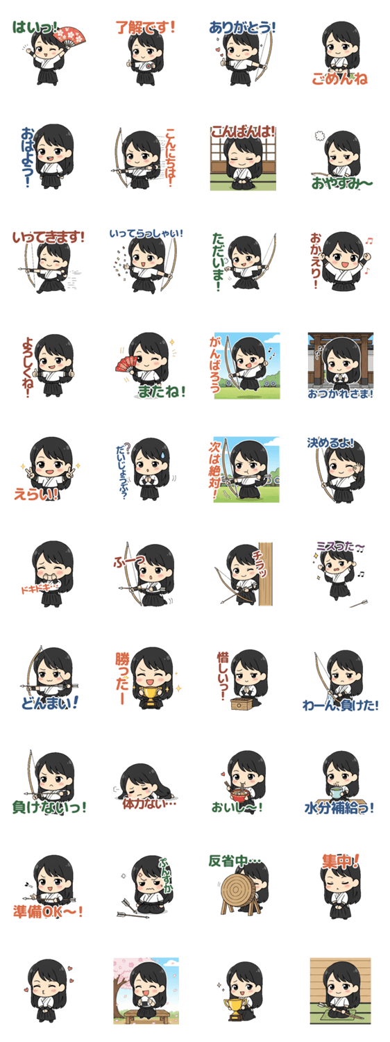 弓道部の女子のスタンプその2です。可愛いちびキャラです。元気いっぱい!挨拶から部活動まで毎日使えるリアクション満載のセット。日常会話や友達とのやりとりにどうぞ♪