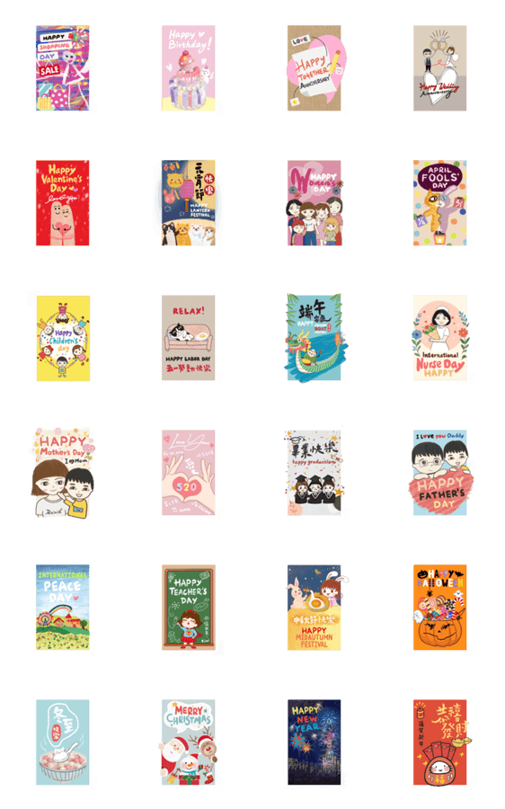 | スタンプ説明 | illustrated greeting card. Send to family, friends and all loved ones These stickers will show up extra large in chats. |