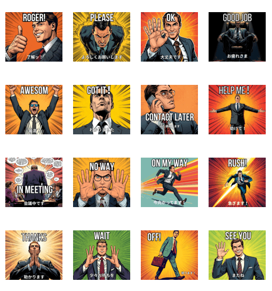社会人の毎日をちょっとシュールに!劇画調×ビタミンカラーで「了解」「おつかれ」「帰ります」など仕事でつかるフレーズをまとめました。