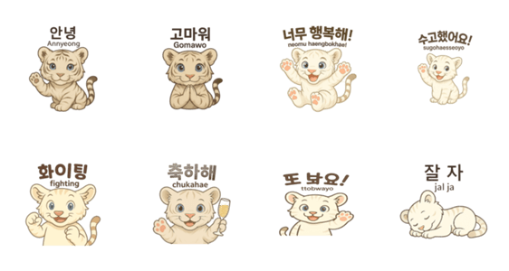 ふわもこ毛並みのホワイトタイガー「しろとら」がおはよう・ありがとう・おやすみなど毎日の気持ちを韓国語で大人可愛く伝えてくれる、便利なフレーズスタンプです。