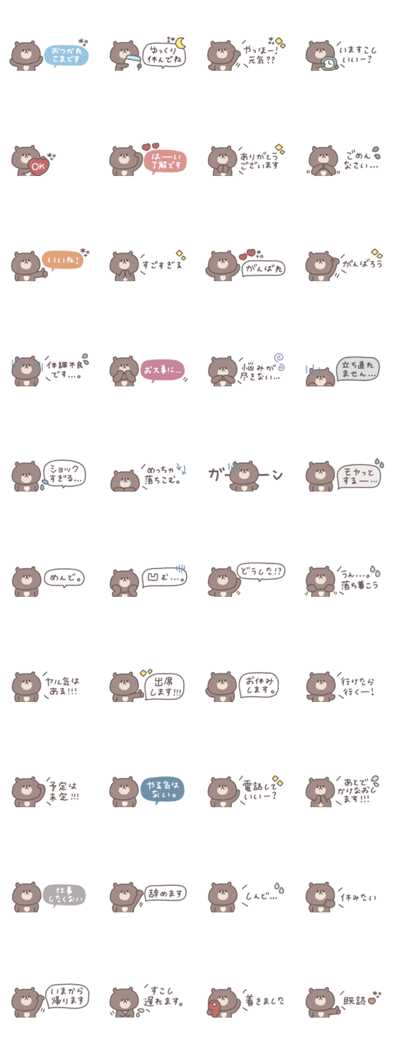 | スタンプ説明 | 一つあると便利な小さくてかわいいくまのスタンプです。 くま/大人可愛い/シンプル/あいさつ/吹き出し/くすみカラー/無気力/ネガティブ |