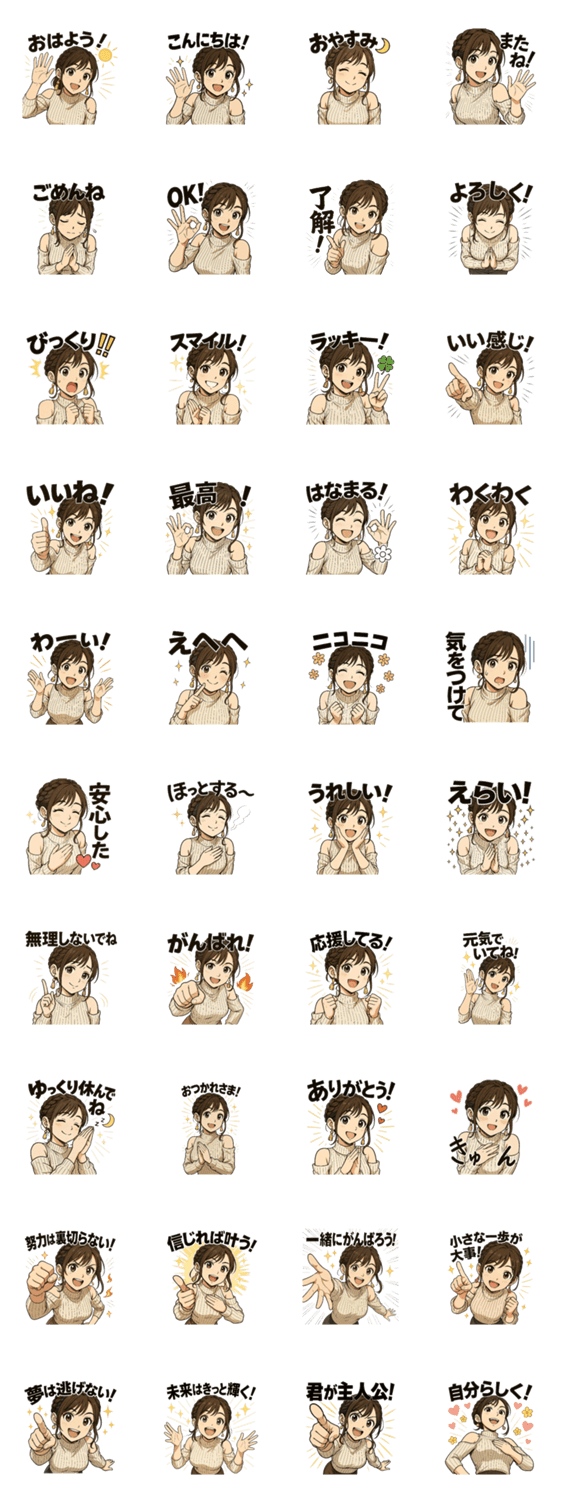 | スタンプ説明 | 明るく元気な女の子の定番〜前向きな言葉で構成された40個のスタンプです!友達や家族様々な人に使いやすいデザインにしました! |