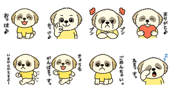 シーズー「ぽて」がモデルのスタンプ『ぽてぽて日記』。まんまるで愛らしい表情や仕草が、あいさつや気持ちをやさしく伝える毎日使える癒し系スタンプ♪