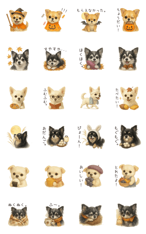 「うちの子スタンプ四季」シリーズ秋Ver. ふんわりタッチでリアル感もある6匹のチワワさんたち。ほっこり癒しのイラストで、毎日のトークや秋イベントにぴったり!