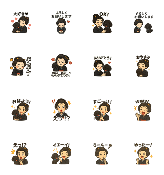 スタンプ説明 芸妓さんと黒いプードルのかわいいスタンプ