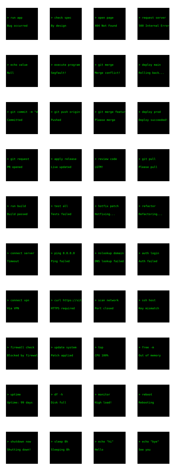 黒背景に緑文字でおなじみのターミナル画面が、LINEスタンプに! 「404 Not Found」「LGTM!」「CPU 100%」など、エンジニアあるあるを40種類収録。